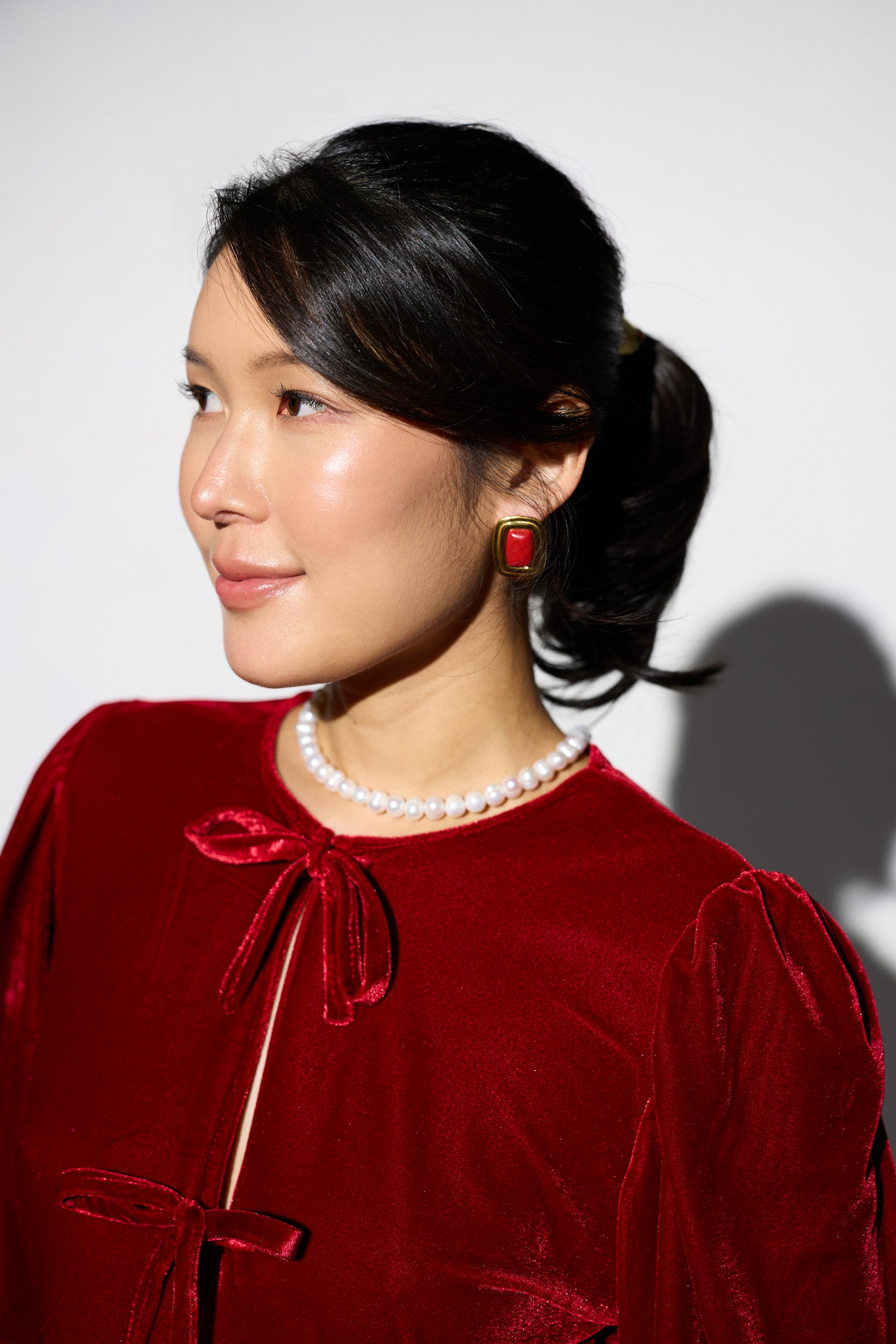 Cercei realizati din inox placat cu aur de 18k si agata rosie (hipoalergenici si anti-tarnish).