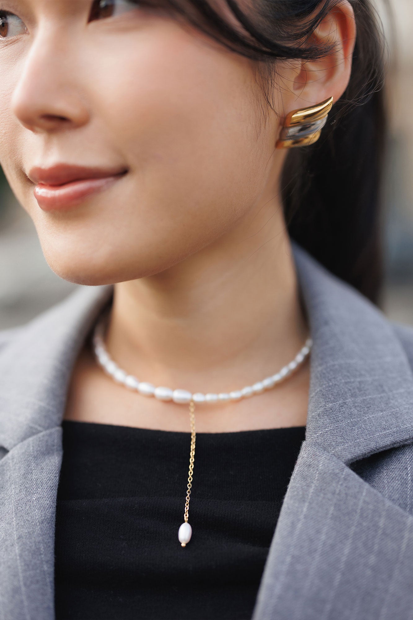 Colier, inox, aur, hipoalergenic, cadou, handmade, realizat manual, bijuterii, perle de cultura, pandantiv, perla baroc, auriu, pietre semipretioase, hematite, , accesorii, handcrafted, statement, lant, lantisor, cadou, asimetrie