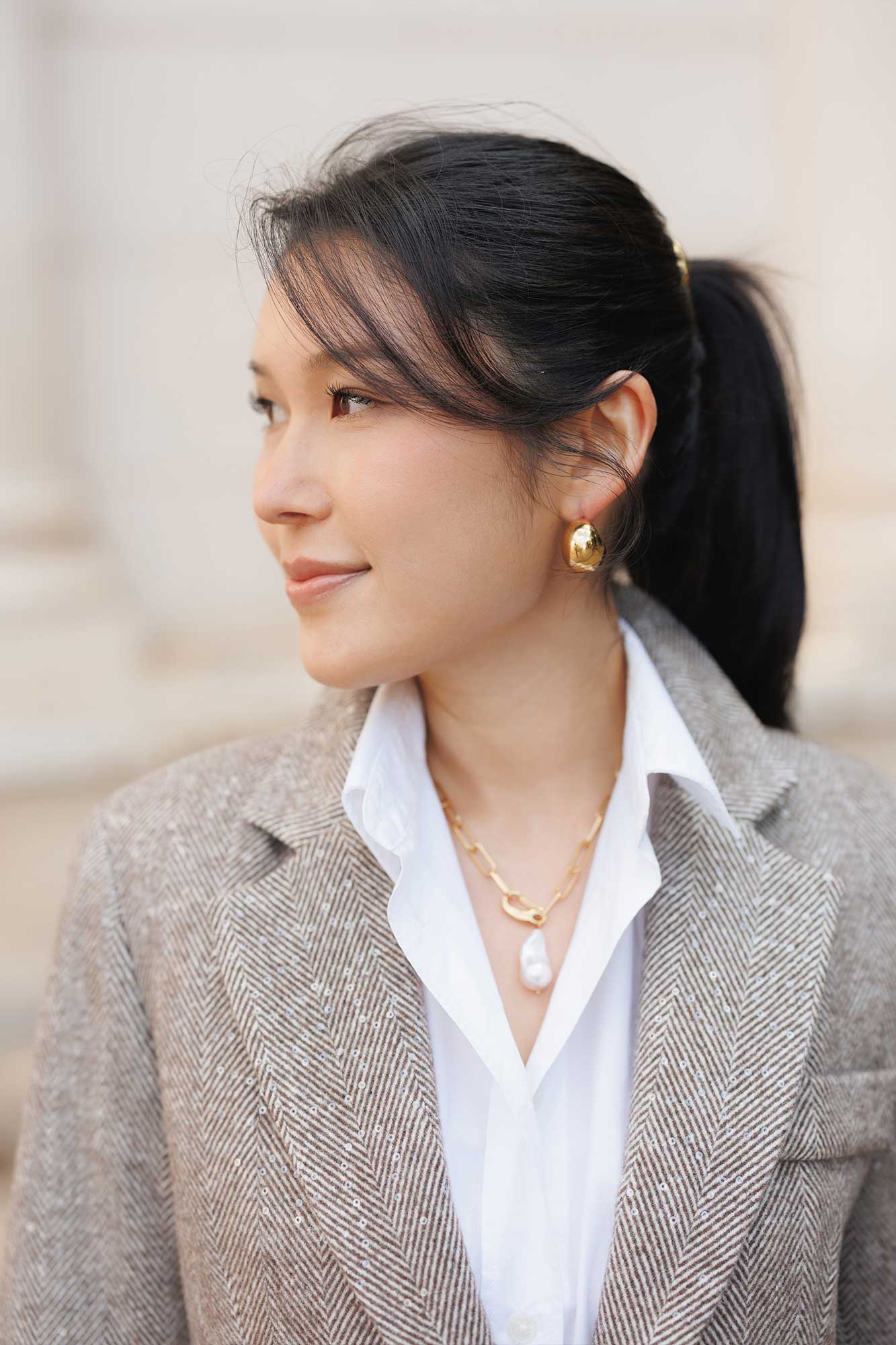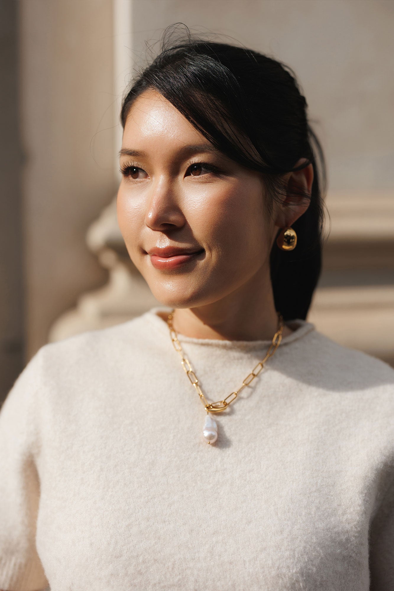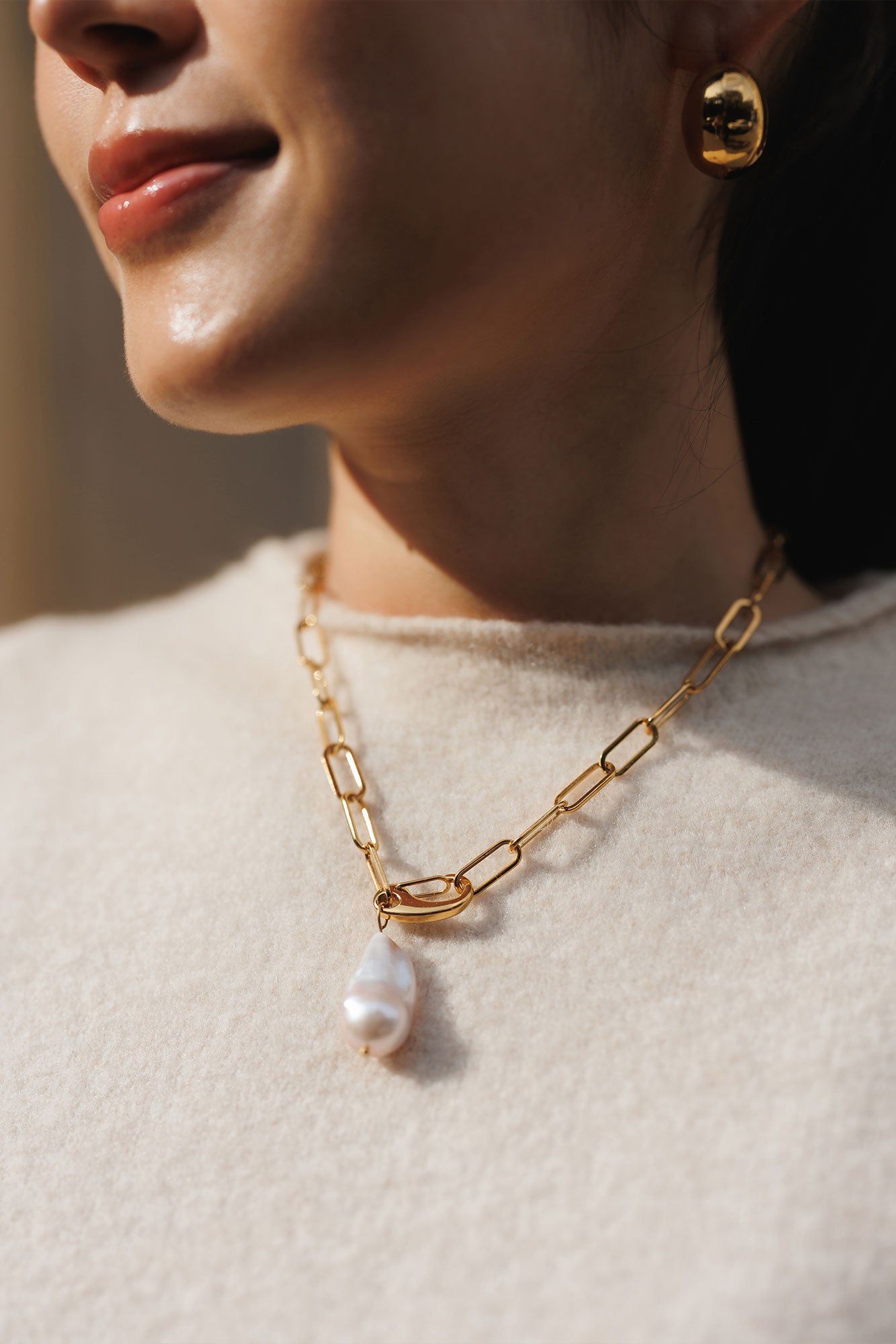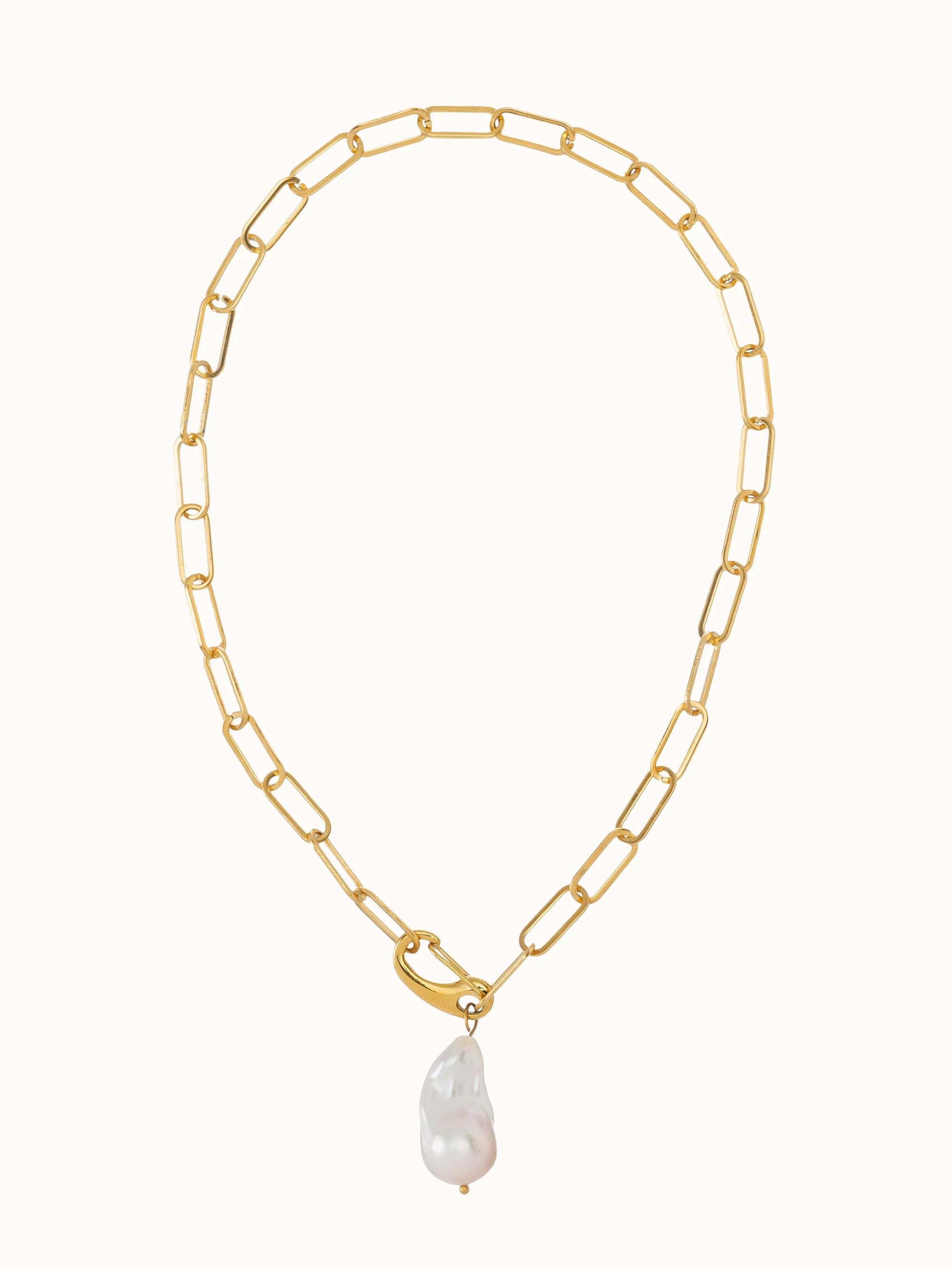 Colier realizat din lant tip agrafa, elemente din inox placat cu aur de 18k (hipoalergenic si anti-tarnish) si perla de cultura tip baroc.